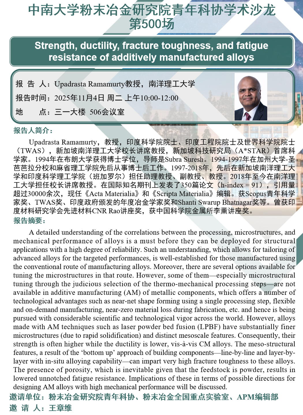 A detailed understanding of the correlations between the processing, microstructures, andmechanical performance of alloys is a must before they can be deployed for structuralapplications with a high degree of reliability. Such an understanding, which allows for tailoring ofadvanced alloys for the targeted performances, is well-established for those manufactured usingthe conventional route of manufacturing alloys. oreover, there are several options available foltuning the microstructures in that route. However, some of them-especially microstructuraltuning through the judicious selection of the thermo-mechanical processing steps-are not available in additive manufacturing (AM) of metallic components, which offers a number oftechnological advantages such as near-net shape forming using a single processing step. flexibleand on-demand manufacturing, near-zero material loss during fabrication, etc. and hence is beingpursued with considerable scientific and technological vigor across the world. However. alloy!made with AM techniques such as laser powder bed fusion (LPBF) have substantially fineimicrostructures (due to rapid solidification) and distinct mesoscale features. Consequently, theistrength is often higher while the ductility is lower, vis-à-vis CM alloys. The meso-structuralfeatures, a result of the “bottom up’ approach of building components-line-by-line and layer-by.layer with in-situ alloying capability-can impart very high fracture toughness to these alloysThe presence of porosity, which is inevitable given that the feedstock is powder, results inlowered unnotched fatigue resistance. Implications of these in terms of possible directions fordesigning AM alloys with high mechanical performance wil be discussed.