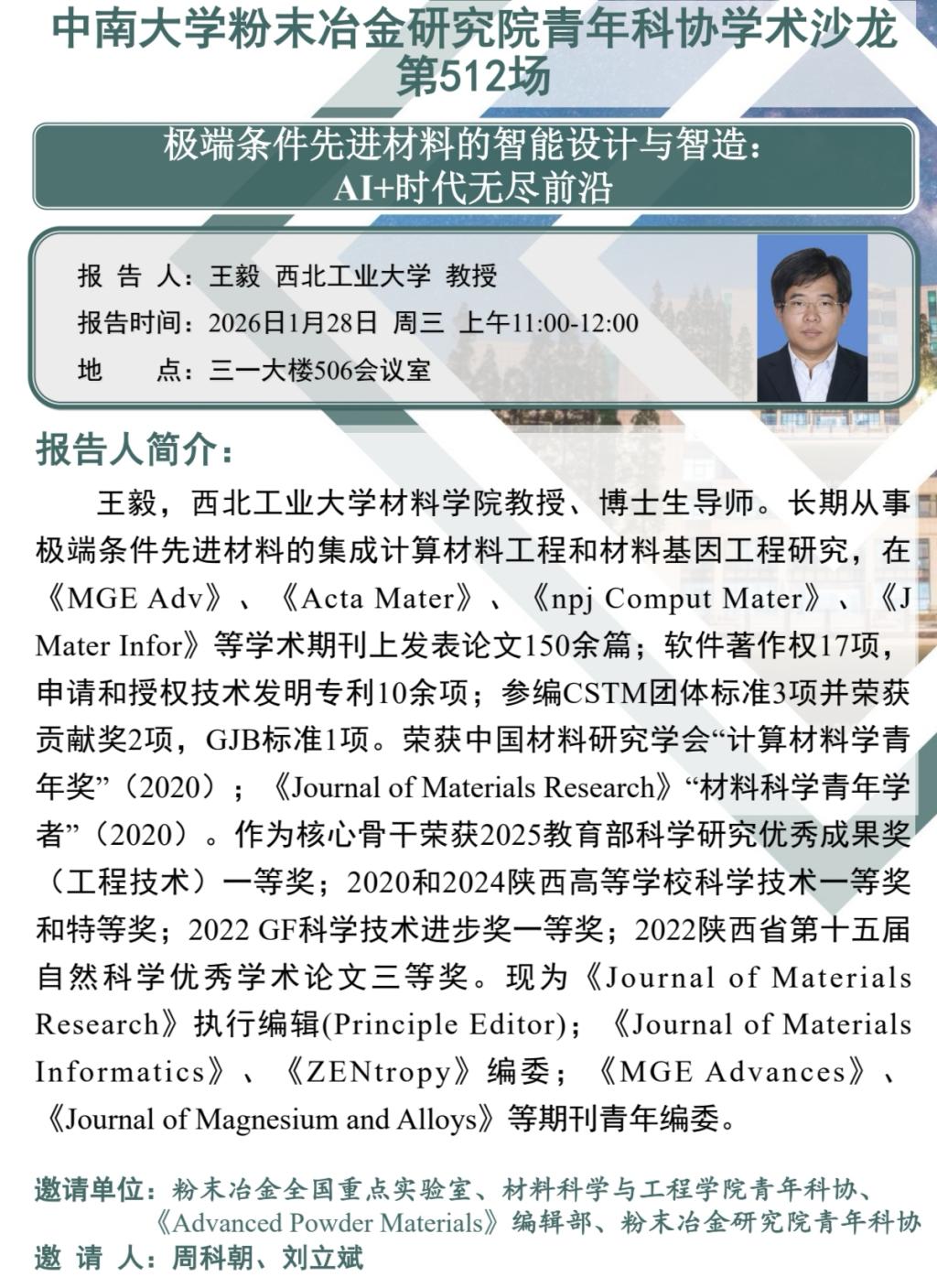 王毅,西北工业大学材料学院教授、博士生导师。长期从事极端条件先进材料的集成计算材料工程和材料基因工程研究,在《MGE Adv》、《Acta Mater》、《npi Comput Mater》、《JMater Infor》等学术期刊上发表论文150余篇;软件著作权17项,申请和授权技术发明专利10余项:参编CSTM团体标准3项并荣获贡献奖2项,GJB标准1项。荣获中国材料研究学会“计算材料学青《Journal of Materials Research》“材料科学青年学年奖”(2020);者”(2020)。作为核心骨干荣获2025教育部科学研究优秀成果奖(工程技术)一等奖;2020和2024陕西高等av自拍