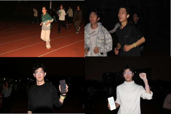 随着起跑指令发出,参与者分批从起点出发,沿操场跑道有序前进。跑道沿途设有引导点,工作人员手持荧光棒随行陪跑,为参与者指引方向,并适时提醒大家注意安全、控制配速。